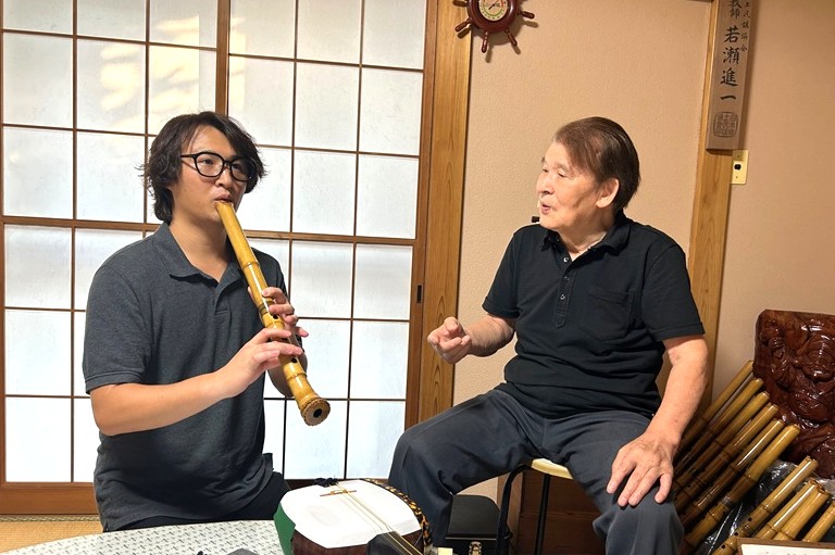 民謡で使用される楽器は主に尺八や三味線、太鼓です。尺八や三味線の音の調整には高度で繊細な技術が求められ演奏中には常に唄い手に合わせて音階の微調整を行う必要があります。尺八は音の高さに応じて複数の音程が違う尺八を使い分けますし、演奏者は息の使い方や指の動かし方にも細心の注意を払わなければなりません。また楽器は竹や革など天然素材で作られているから天候や湿度の影響で楽器の響きが変わってしまいます。上手に演奏できるようになるには熟練の技が必要で、私は永遠に終点は無いと思っています。